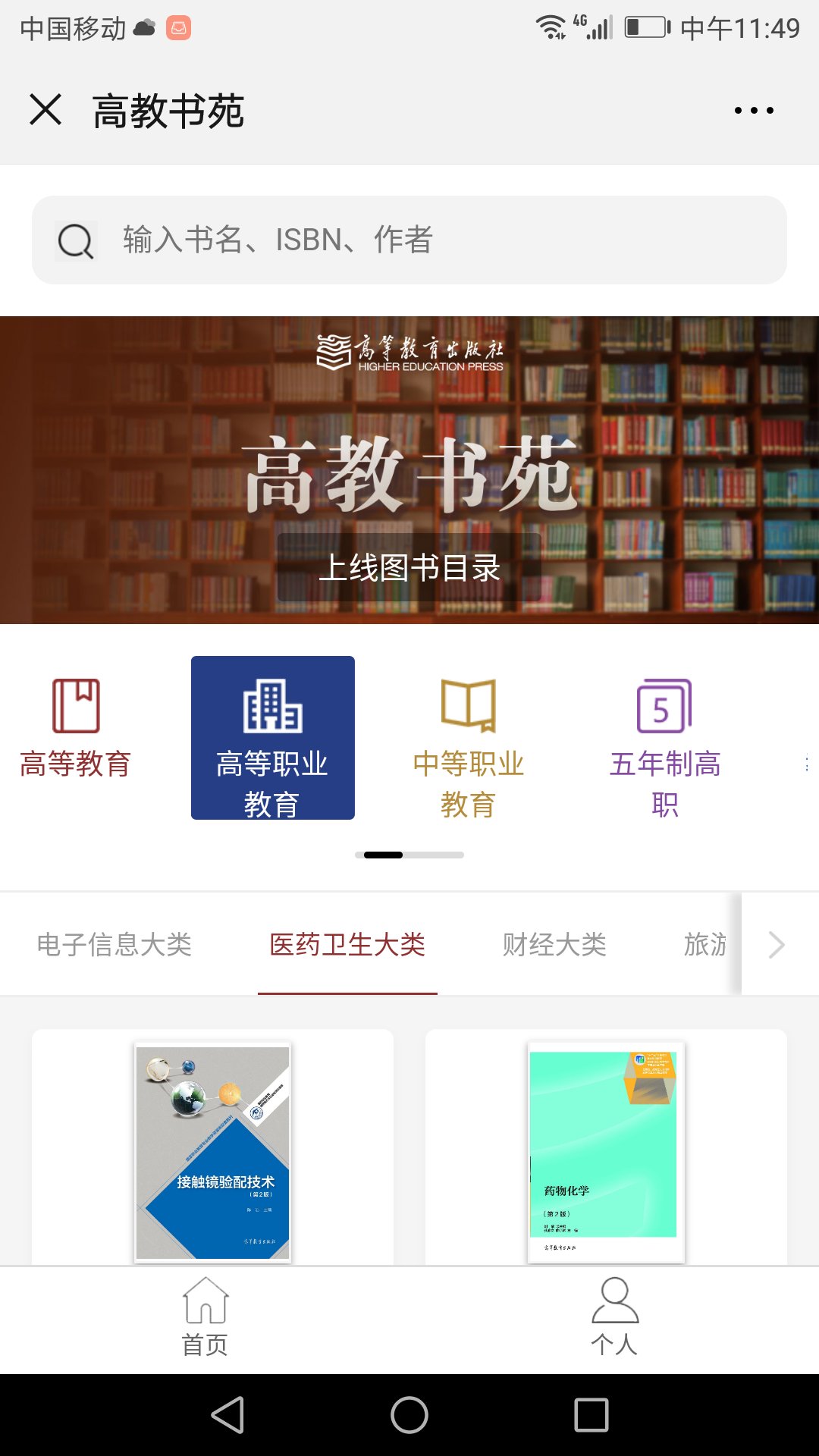 请输入网址https://ebook.hep.com.cn/ebooks/h5/index.html#/,进入“高教书苑”主页面,点击右下角“个人”图标进入“手机验证码登录/微信登录”界面:①请输入手机号码→获取验证码→输入验证码→登录;②请点击页面底部微信图标,选择“允许”微信登录→登录。