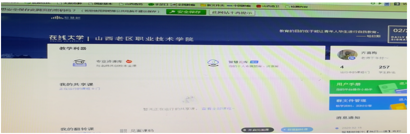 闫宏丽老师采用“ 翻转课堂见面课 ”的方式讲授《 中医内科学 》课程。课后,闫老师和群里的同行们及时做了交流,她说:网络拥堵现象出现时,我及时启动了微信群直播互动功能,顺利地完成了开学第一课。