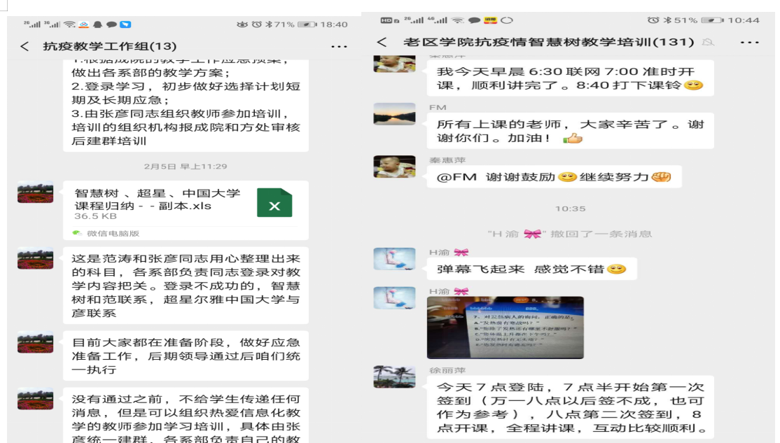 2. 教学平台使用及运行情况。应广大教师要求,目前主要以以智慧树教育教学平台为主,结合中国大学MOOC和超星学习通等平台,以及微信等社交工具,作为线上教学工作的途径,为保证线上教学组织有秩序、教学质量有保障、教学过程有监督,对“抗疫教学工作组”、“老区学院抗疫情智慧树教学培训组”两个工作群采取认证制,由教务处统一负责管理。采取院系两级制对教师培训与备课、教学组织与管理工作等进行督导检查,维护教学秩序稳定正常。