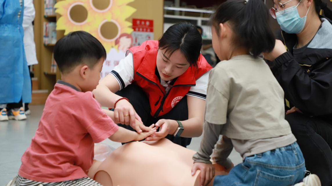 图3.临汾职业技术学院护理系学生走进临汾市图书馆为小学生们讲授心肺复苏术,培养孩子们的社会责任感与急救意识