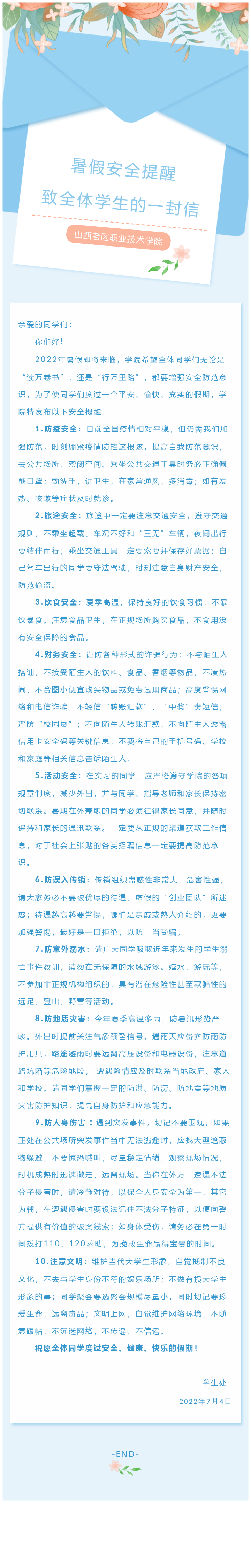 暑假安全提醒——致全体学生的一封信