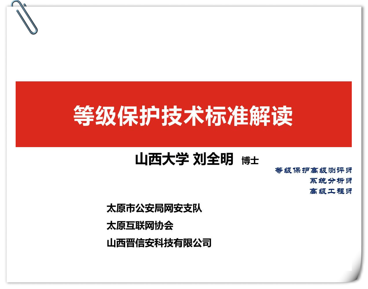 太原市公安局的领导首先针对当前国际国内的信息安全形势做了详细的分析,我国把网络空间作为国防战略的第五阵地,并出台了《中华人民共和国计算机信息系统安全保护条例》,并对计算机信息系统实行分等级保护的迫切感、重要性和强制性进行解析。