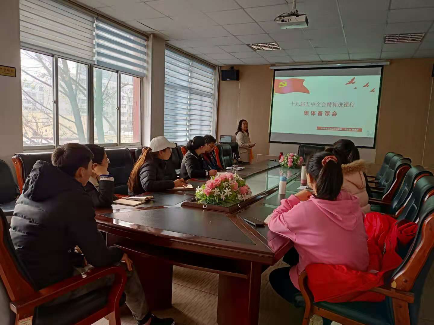 11月20日下午,思政部全体专兼职教师和学院各系部辅导员在二层会议室进行了“十九届五中全会精神”进课堂的集体备课会。
