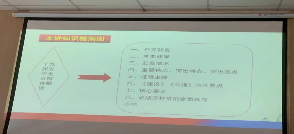 张老师围绕会议召开的重大意义、了解取得的重大成果、突出特点,阐释党在新阶段十二个方面做出的重大发展部署;从新时代、新思想、新阶段、新征程的视角出发,阐述中国要建设什么样的国家,实现什么样的发展,达到什么样的目标等一系列问题;重点讲述了坚持党的领导和伟大复兴的中国梦之间密不可分的关系。