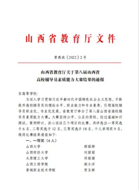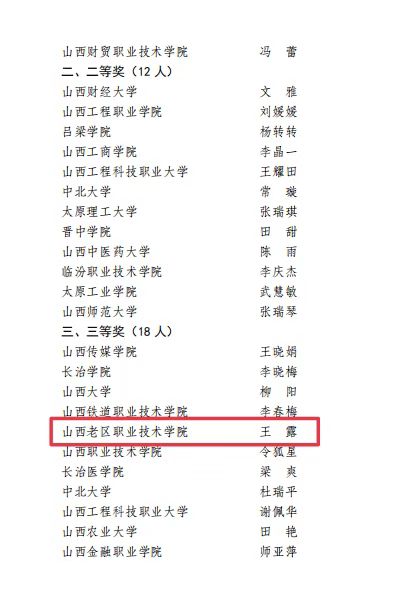 5月16日-5月19日,由山西省教育厅主办的“第八届全省高校辅导员素质能力大赛决赛”因疫情影响在线上举办,共有来自全省各个高校的69名选手参赛,护理系王露老师代表我院参加了本次大赛。经过三天的激烈角逐,王露老师最终荣获比赛三等奖的佳绩。
