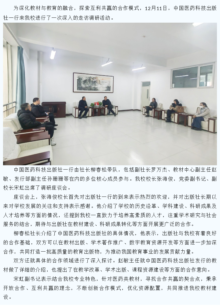 深化教材共融合 共谋发展新篇章——中国医药科技出版社到新葡8883走访调研