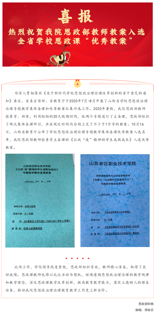 我院思政部教师教案入选全省学校思政课“优秀教案”