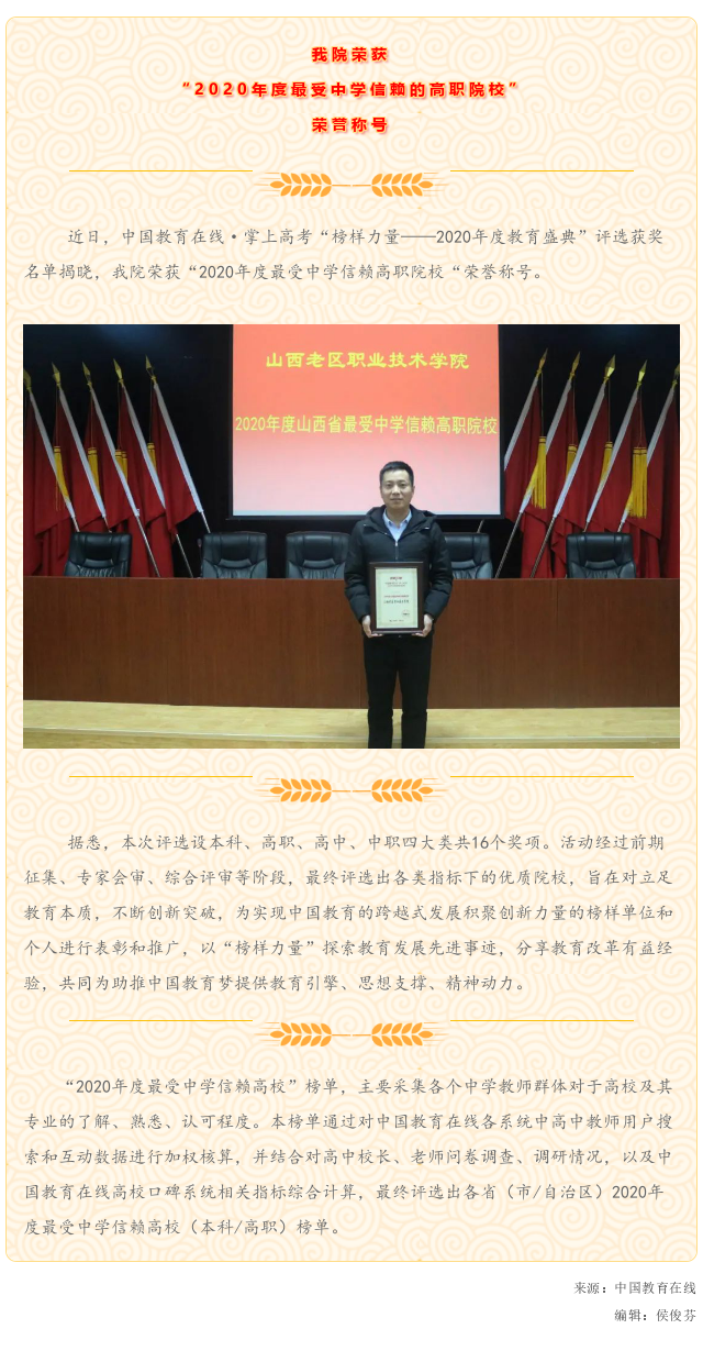 我院荣获 “2020年度最受中学信赖的高职院校”荣誉称号