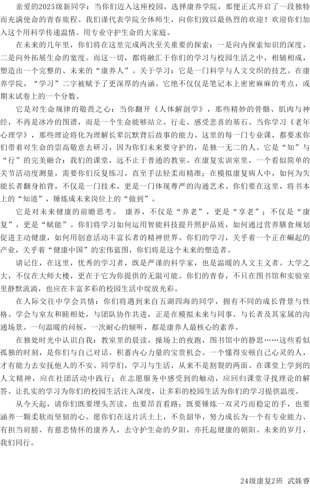 筑梦“康”途 盼你加入——给2025级学弟学妹的一封信