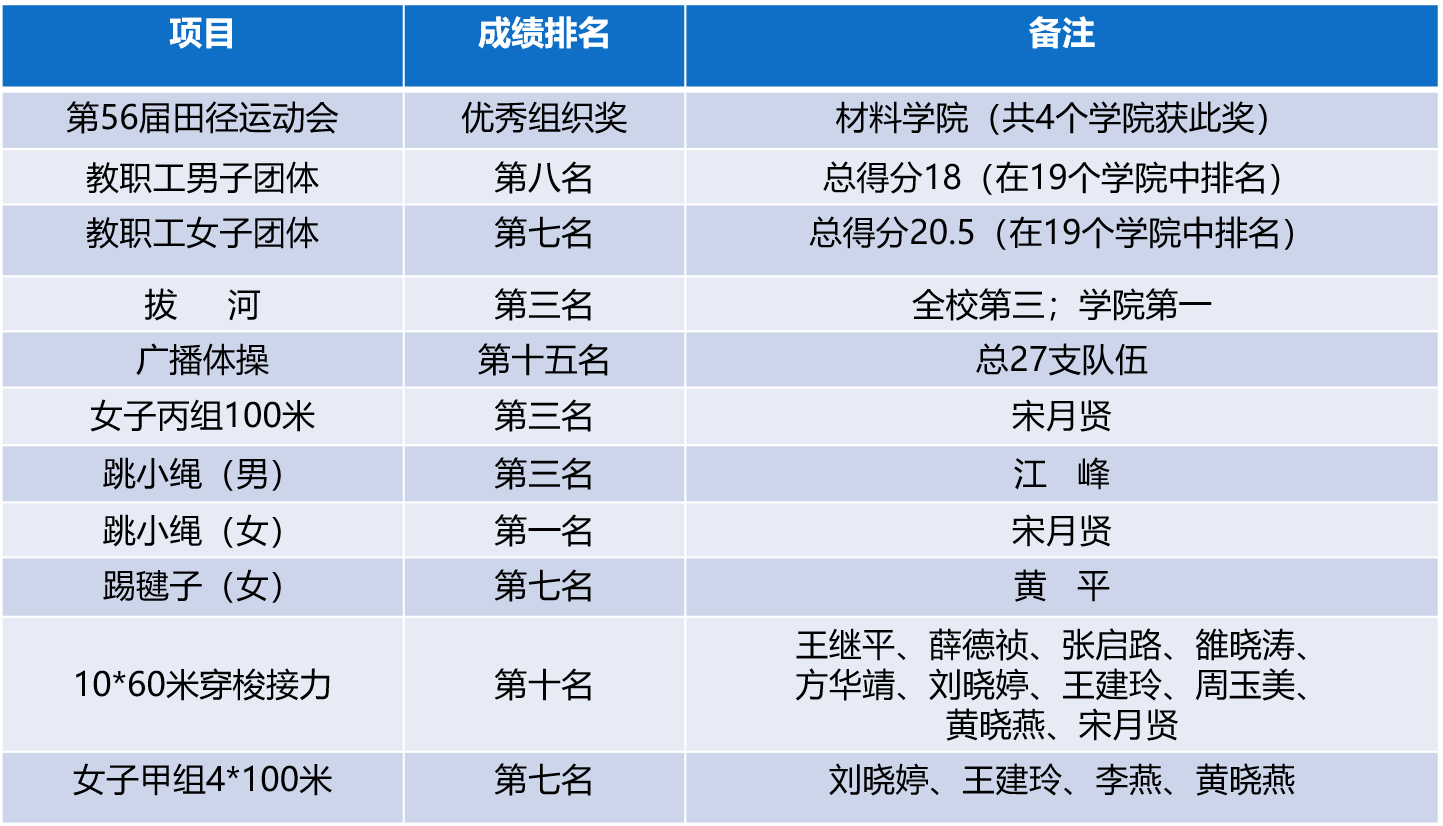 本届运动会的成绩,离不开每一位材料人热情参与,分秒必争和无私奉献。希望来年运动会,继续发扬奋进拼搏、团结一致的精神,勇担新传人责任,再创佳绩,铸造辉煌。